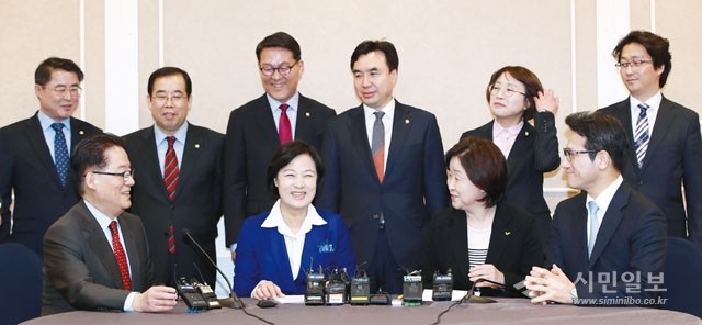 21일 오전 국회 귀빈식당에서 열린 야4당 대표 회동에서 각 당 대표들이 대화하고 있다. 앞줄 왼쪽부터 국민의당 박지원, 더불어민주당 추미애, 정의당 심상정, 바른정당 정병국 대표.