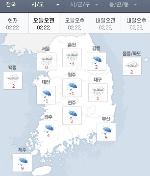 서울은 현재 오전 0도, 춘천은 영하 3도, 대전 영하 1도 부산 5도, 광주 4도를 기록 중이다. 오후에는 서울 4도, 춘천 4도, 대전 6도, 부산 12도, 광주 10도까지 올라간다.