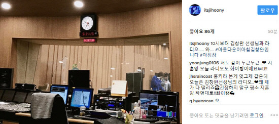 신지훈은 자신의 인스타그램을 통해 22일 ‘10시부터 김창완 선생님과 라디오..... 와.... #아름다운이아침김창완입니다 #아침창’이라는 한 장의 사진을 공개했다.