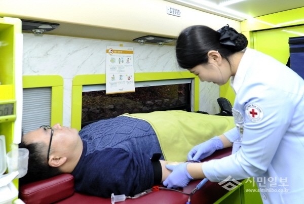 서울 광진구가 22일 오전 9시30분~오후 4시30분 구청 본관 앞 은행나무길 헌혈 차량에서 ‘광진구 가족 사랑의 헌혈’을 실시했다. 사진은 구청 직원이 헌혈을 하는 모습.(사진제공=광진구청)