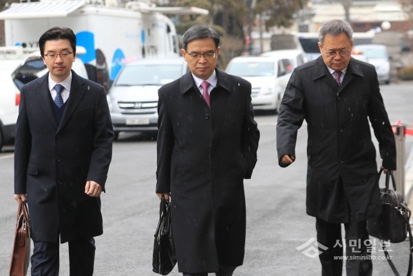 | ▲ 탄핵심판 16차 변론이 열린 22일 오전 서울 종로구 재동 헌법재판소에서 이중환 변호사를 비롯한 대통령측 변호인단이 대심판정으로 향하고 있다.(사진제공=연합뉴스) | ||