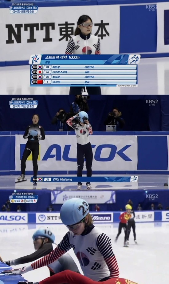 최민정은 22일 일본 홋카이도 삿포로의 마코마나이 실내링크에서 열린 '2017 삿포로 동계아시안게임' 쇼트트랙 여자 1000m 결승에서 심석희와 훈훈한 경쟁 끝에 2위로 결승선을 통과했다.