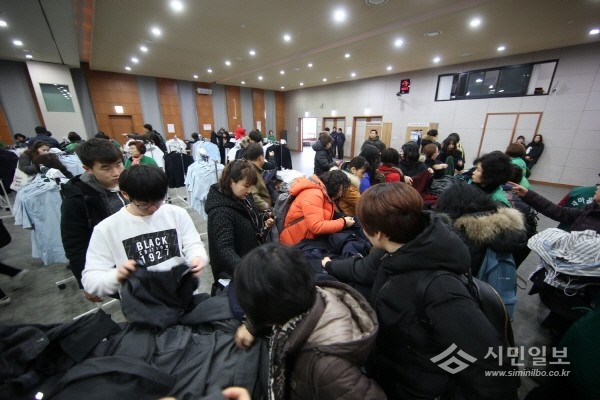 금천구가 지난 22일 오전 10시 구청 12층 대강당에서 ‘2017년 사랑의 교복·도서 나눔 행사’를 개최했다. 사진은 행사에 참여한 학생들과 학부모들이 교복을 고르는 모습.(사진제공=금천구청)