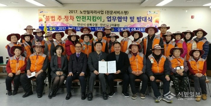 경기 안산시 상록구는 지난 21일 구청 대회의실에서 노인일자리 전담기관 안산시니어클럽과 업무협약을 맺고 노인 28명이 참석한 가운데 '2017년 불법주정차 안전지킴이' 발대식을 열었다. 사진은 참여자들이 기념촬영을 하는 모습.(사진제공=상록구청)