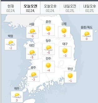 서울 현재 영하 6도, 춘천 영하 8도, 대전 영하 5도, 대구 영하 3도, 부산 영하 1도, 제주가 3도를 기록 중이다.
