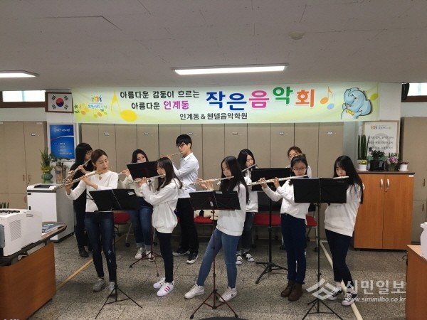 경기 수원시 팔달구 인계동 행정복지센터에서는 지난 22일 민원인이 서류를 발급받는 동안, 음악학원 학생들이 공연을 펼치는 작은 음악회를 개최했다. 사진은 학생들이 악기를 연주하는 모습.(사진제공=팔달구청)