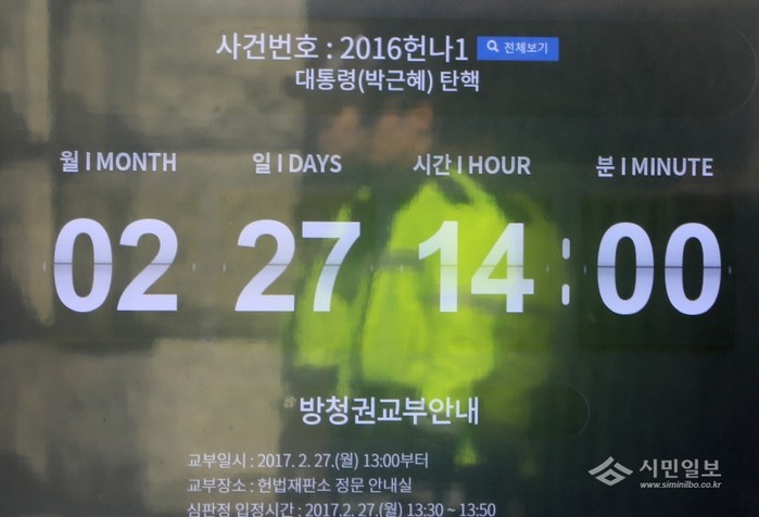 박근혜 대통령 탄핵심판 사건의 최종변론이 하루 앞으로 다가온 26일 오전 서울 종로구 재동 헌법재판소 앞 안내모니터에 탄핵 심판 변론을 알리는 문구가 표시되고 있다.