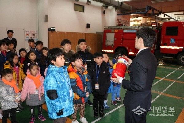 최근 경기 군포소방서는 차고에서 소방관 가족이 참여한 가운데 소방안전체험교실을 운영했다. 사진은 소방서 관계자가 어린이들에게 소화기 사용방법에 대해 설명하는 모습.(사진제공=군포소방서)