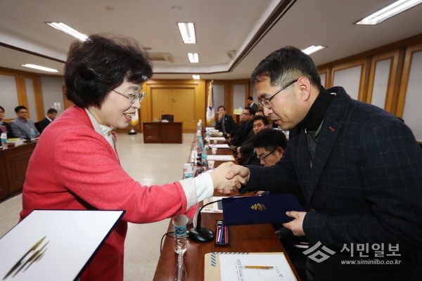 28일 서울 송파구는 대회의실에서 ‘명예건축지도원 표창 및 위촉장 수여식’을 열고 건축분야 전반에 관한 무료 상담 등을 실시할 명예건축지도원 20명을 위촉했다. 사진은 박춘희 구청장(왼쪽)이 명예건축지도원과 악수하는 모습.(사진제공=송파구청)