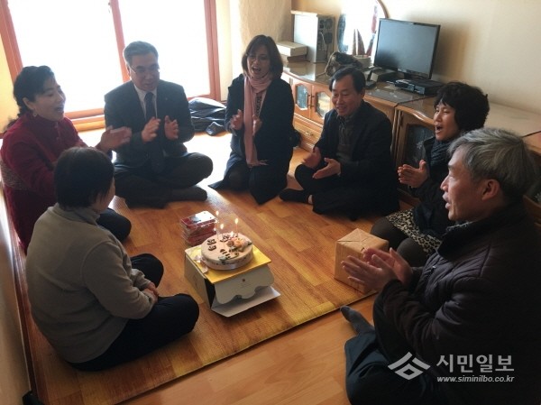 최근 서울 도봉구 방학1동 지역사회보장협의체에서는 지역내 몸이 불편한 노인들을 위한 ‘찾아가는 생신잔치’를 개최했다. 사진은 이날 잔치에 참석한 보장협의체 관계자들이 생일을 맞이한 노인에게 생일 축하인사를 전하는 모습.(사진제공=방학1동)
