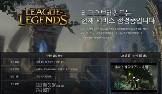 라이엇 게임즈는 롤 홈페이지를 통해 1일 오전 6시부터 낮 12시까지 6시간 동안 점검할 예정이라고 공지했으며 롤 점검 중에는 게임 접속 및 홈페이지 이용을 할 수 없다.