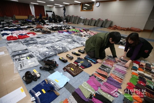 | ▲ 구청 직원들이 짝퉁 상품들을 검찰에 송치하기 전에 분류하고 있다. (사진제공=중구청) | ||