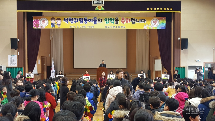 전남 목포시 석현동 소재 석현초등학교 대강당에서 2일 오전 10시30분 신입생과 재학생, 신입생 학부모 등이 참석한 가운데 ‘2017년도 석현초등학교 입학식’이 개최됐다. 사진은 대강당에서 입학식이 진행되고 있는 모습.