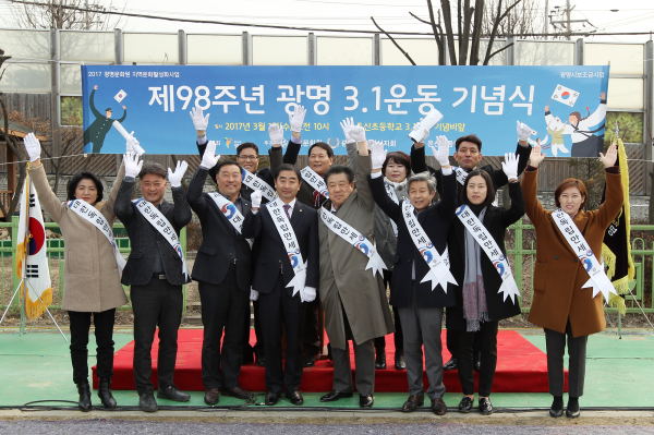 지난 1일 이병주 경기 광명시의회 의장 등 의원들과 함께 안성근 광명문화원장이 98주년 '3.1절 기념식'에서 힘찬 만세삼창을 하고 있다.