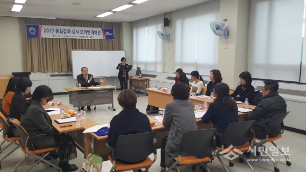최근 경북 구미시에서는 지난 27일 오후 3시 시립중앙도서관 3강의실에서 2017년 도서관 문화강좌 강사 19명이 참석해 오리엔테이션을 가졌다. 사진은 김종원 도서관장 및 관계자들이 이야기를 나누는 모습.(사진제공=구미시청)
