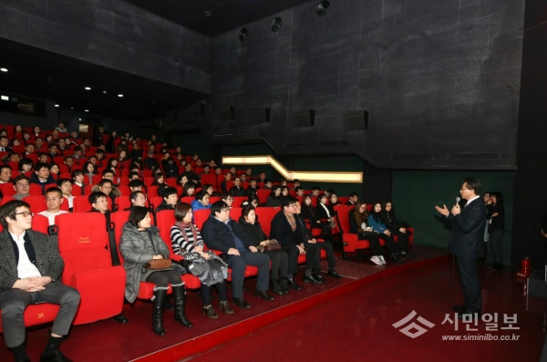 서울 종로구 1300여명 전 직원이 최근 관내 위치한 서울극장을 방문해 영화 <나, 다니엘 블레이크>를 관람했다. 사진은 영화 시작 전, 김영종 구청장이 인사말을 하는 모습.(사진제공=종로구청)