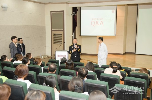 최근 서울 구로소방서는 구로 고대병원 대강당에서 ‘골든타임 어떻게 대처할 것인가’란 주제로 병원 관계자 특별 소방안전교육을 실시했다. 사진은 장현태 서장이 특강을 진행하는 모습.(사진제공=구로소방서)