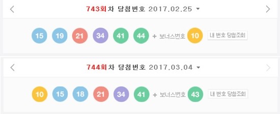 앞서 743회차 당첨 번호는 15, 19, 21, 34, 41, 44, 보너스 번호 10으로 2회 연속 10과 15, 41이 연속으로 뽑혔다.