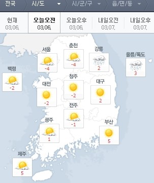 오늘 오전 서울 영하 4도, 춘천 영하 4도, 대전 영하 2도, 강릉 2도, 부산 5도를 기록 중이다.
