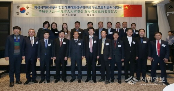 | ▲ 지난 6일 푸르미르호텔에서 열린 경기 화성시의회와 중국 화룡시 인민대표대회상무위원회의 우호교류 의향서 체결식에서 양기관 관계자들이 기념촬영을 하고 있다.(사진제공=화성의회) | ||