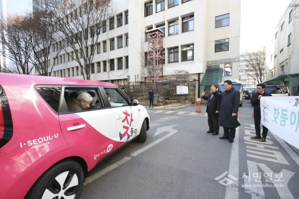 지난 7일 종로구청 주차장에서 ‘찾아가는 동주민센터’의 활성화를 위해 현장방문 업무에 투입될 ‘찾동이(전기차) 발대식’이 개최됐다. 사진은 김영종 구청장(오른쪽 가운데)이 찾동이에 타고 있는 직원들과 주민들에게 손을 흔들고 있는 모습.(사진제공=종로구청)