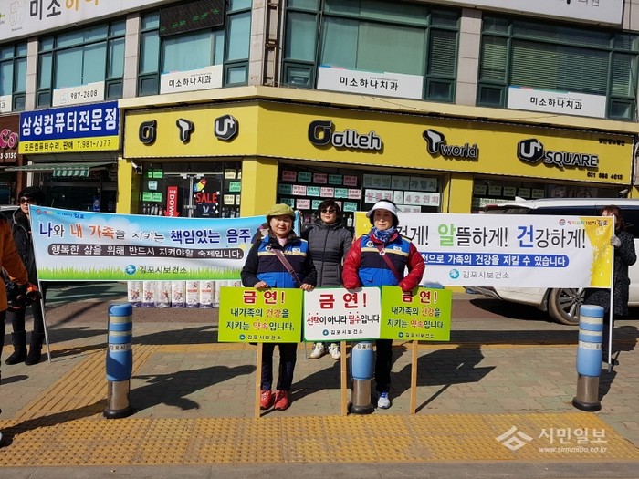 경기 김포시보건소는 지난 6일 양촌읍 세계로마트 사거리와 양곡시장 주변에서 지역주민을 대상으로 보건소에서 추진 중인 '통합건강증진사업 가두 캠페인'을 실시했다. 사진은 관계자들이 금연·절주 등의 건강 캠페인을 진행 중인 모습.(사진제공=김포시청)