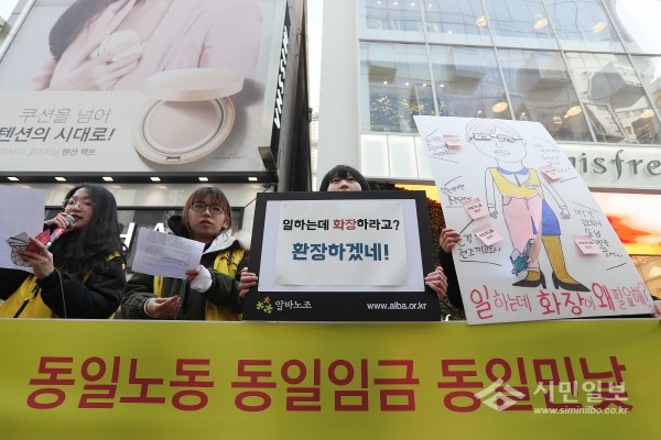 세계 여성의 날인 8일 오전 서울 중구 명동거리에서 알바노조 회원들이 '동일노동 동일임금 동일민낯'을 주제로 기자회견을 하고 있다. 이들은 여성 알바 노동자에게 가해지는 외모 통제 및 친절한 태도 강요, 준비시간 임금 미지급, 업무 사비 지금 등을 문제제기 했다.