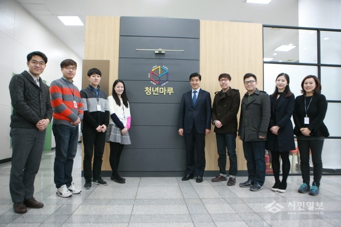 지난 8일 서울 강동구의회 1층에 회의실과 코워킹 스페이스 등으로 조성된 청년 공유공간 ‘청년마루 성일센터’가 문을 열었다. 사진은 성일센터 개소식에 참석한 이해식 구청장(오른쪽에서 다섯 번째)이 관계자들과 함께 기념촬영을 하고 있는 모습.(사진제공=강동구청)
