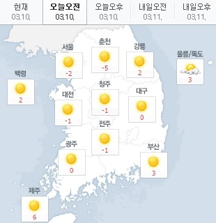 이날 오전 서울은 영하 2도, 춘천 영하 5도, 대전 영하 1도, 부산 3도, 제주 6도를 기록 중이다.