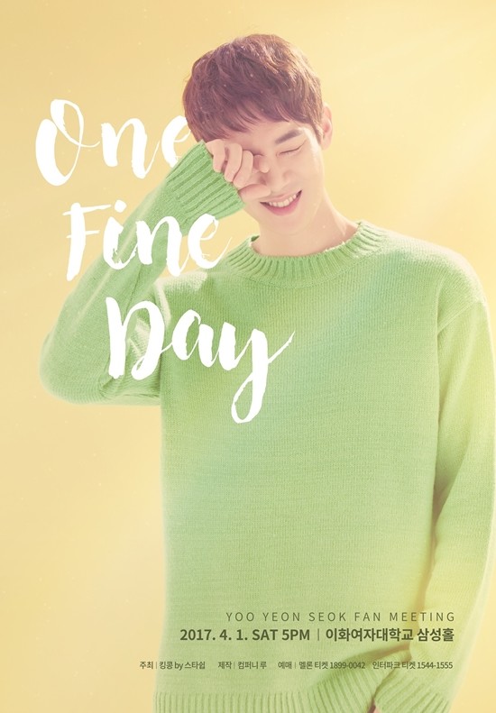 유연석의 국내 팬미팅 ‘One Fine Day’는 4월 1일 5시 서울 이화여자대학교 삼성홀에서 열리며, 오는 3월 14일 저녁 8시부터 멜론티켓과 인터파크를 통해 예매가 이뤄질 예정이다.