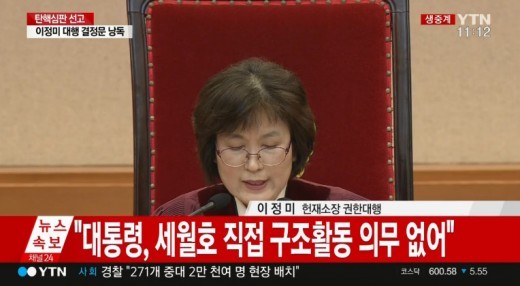 이때 이정미 재판관은 “지난 90여일동안 재판관들은 사건을 공정하게 해결하기 위해 힘썼다”라고 전했다.