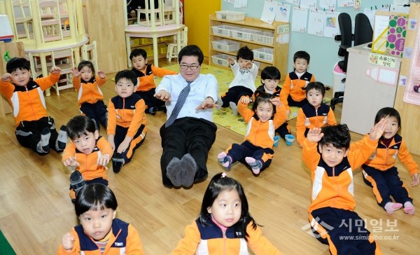 최근 서울 광진구 구의2동 소재 신예지 어린이집에서 열린 ‘미취학 아동 신체활동 늘리기’ 프로그램에서 김기동 광진구청장이 어린이들과 함께 어린이 성장발달 단계에 맞춘 운동 V자 만들기를 하고 있다.(사진제공=광진구청)