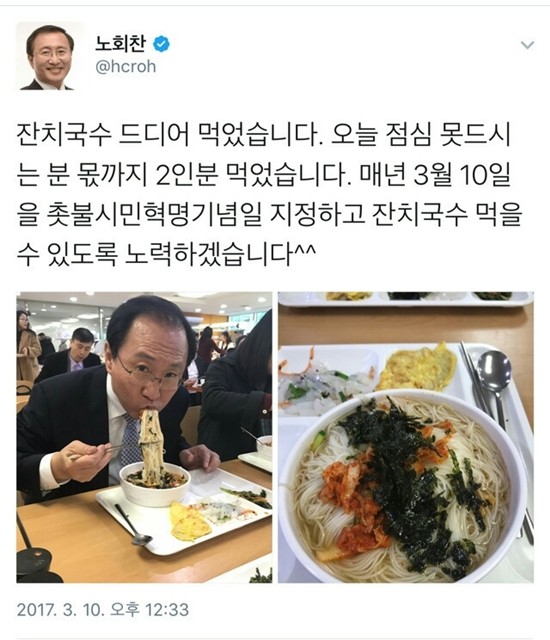 정의당 노회찬 의원은 이에 대해 자신의 트위터를 통해 "매년 3월 10일을 촛불 시민 혁명 기념일로 지정하고 잔치국수를 먹을 수 있도록 노력하겠다"며 "못 먹는 그분(박근혜)을 위해 2인분을 먹었다"고 남겨 웃음을 자아내기도 했다.