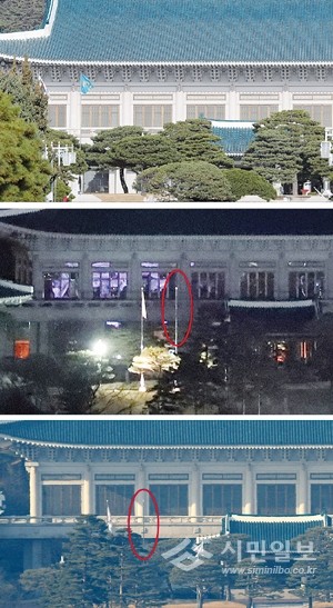 청와대는 박근혜 전 대통령에 대한 헌법재판소의 파면 선고가 내려진 10일 오후에 청와대 본관에 게양된 봉황기를 내린 것으로 확인됐다. 청와대에서 /대통령을 상징하는 봉황기를 내린 것은 헌법재판소의 박 전 대통령에 대한 탄핵으로 현직 대통령이 부재하기 때문인 것으로 알려졌다. 사진은 위로부터 첫 번째 탄핵 심판 선고 전 평소의 청와대 본관 모습으로 봉황기가 태극기 옆에 걸려 나부끼고 있다. 가운데는 탄핵 심판 선고일인 10일 오후 7시30분께 봉황기가 사라진 모습. 맨 아래는 11일 오후 역시 봉황기가 게양되지 않은 모습.