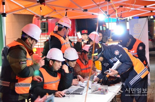 서울 강남소방서는 지난 13일 오후 8시13분경 수서교회(강남구 수서동 소재) 3층 대예배실 인테리어 공사중 화재발생을 가상, 긴급구조통제단 불시 가동훈련을 실시했다. 사진은 통제단 각반의 역할 및 임무숙지훈련이 진행 중인 모습.(사진제공=강남소방서)
