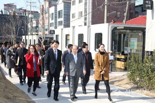 지난 10일 오후 박홍섭 서울 마포구청장(우측 세번째)이 타 지자체의 특화거리조성 우수사례 공유를 위한 벤치마킹을 하고자 경의선 책거리를 방문한 최창식 중구청장(우측 네번째) 및 관계자들과 현장투어를 하고 있다.(사진제공=마포구청)