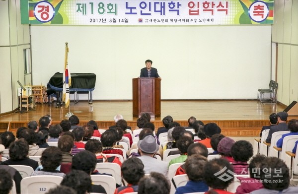 인천 계양구는 14일 노인복지관 대강당에서 제18회 대한노인회 계양구지회 부설 노인대학 입학식을 개최했다. 사진은 입학식에 참석한 박형우 구청장이 인사말을 하는 모습.(사진=계양구청)