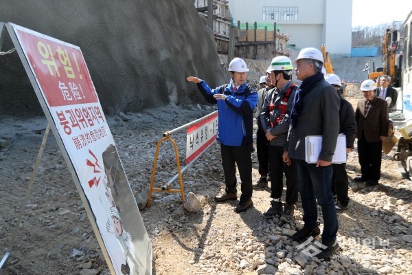 문석진 서울 서대문구청장(맨 왼쪽)이 14일 서울 서대문구 홍제2구역 주택재개발 정비사업 구역에서 관계자들과 함께 해빙기 위험시설을 점검하고 있다./연합뉴스