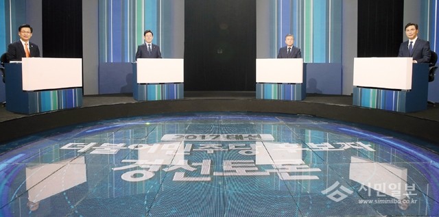 더불어민주당 대선주자인 최성 고양시장(왼쪽부터), 이재명 성남시장, 문재인 전 대표, 안희정 충남도지사가 14일 오후 서울 여의도 KBS 본관에서 열린 더불어민주당 제19대 대통령선거후보자 방송사 합동토론회에 참석하고 있다.