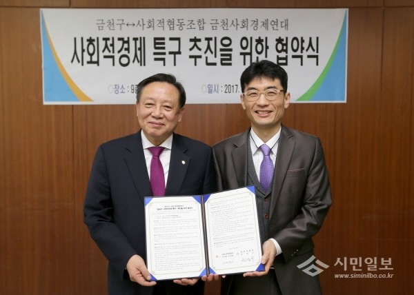지난 2월 사회적경제 특구 본사업에 선정된 금천구가 지난 14일 구청 소회의실에서 사회적협동조합 금천사회경제연대와 업무협약을 체결했다. 사진은 차성수 구청장(왼쪽)과 신성호 금천사회경제연대 이사장이 협약서를 들고 기념촬영하는 모습.(사진제공=금천구청)