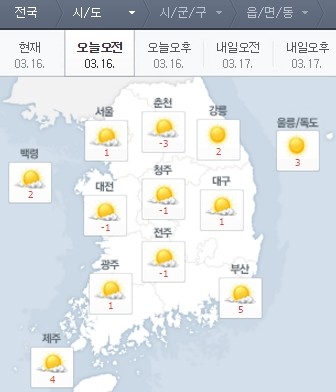 현재 서울은 1도, 대전 영하 1도, 춘천 영하 3도, 부산 5도, 제주 4도를 기록 중이다.