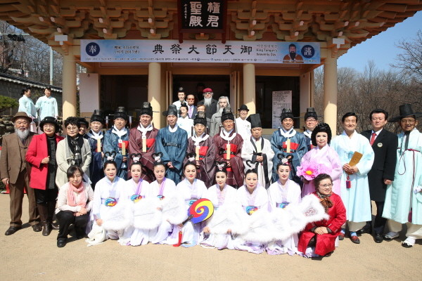 지난 15일 서울 종로구의회 김복동 의장과 선상선 부의장, 경점순 운영위원장, 배효이 행정문화위원장, 안재홍·박노섭·윤종복 의원이 단기 4350년을 맞아 사직공원내 단군성전에서 개최된 '어천절 대제 봉행'에 참석했다. 사진은 행사 참여자들이 기념촬영을 하는 모습.(사진제공=종로구의회)