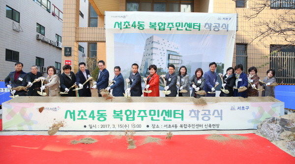 서초구는 지난 15일 낡은 서초4동 주민센터를 어린이집, 여성회관 등 문화·복지시설을 갖춘 복합청사로 신축하는 착공식을 개최했다. 사진은 착공식에 참여한 조은희 구청장(가운데) 및 관계자들이 기념 시삽을 하는 모습.(사진제공=서초구청)