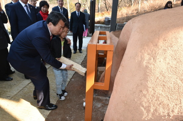 중랑구는 지난 15일 오후 3시 봉화산에서 시 최초로 '옹기테마공원' 개장식을 개최했다. 사진은 개장식에 참석한 나진구 구청장이 어린이와 함께 전통옹기가마 체험을 하는 모습.(사진제공=중랑구청)