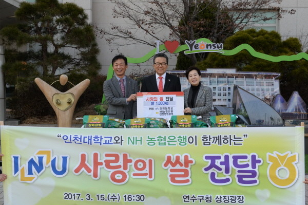 인천 연수구는 지난 15일 국립인천대학교와 NH농협 인천대 지점으로부터 사랑의 쌀 100포(백미10㎏)를 전달받았다. 사진은 이재호 구청장(가운데) 및 관계자들이 기념촬영을 하는 모습.(사진제공=연수구청)