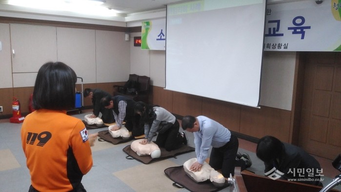 서울 영등포소방서는 지난 15일 영등포구청 대강당에서 구청 문화체육과 직원들을 대상으로 봄꽃축제 운영요원에 대한 사전 안전교육을 실시했다. 사진은 교육에서 심폐소생술 등의 소방안전교육이 진행되고 있는 모습.(사진제공=영등포소방서)