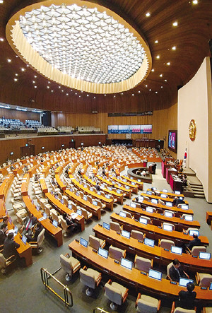 16일 오후 국회에서 열린 제350회 국회 제1차 본회의에서 열린 탄핵인용 이후 정국 정상화 논의를 위한 긴급 현안질문에서 1시간 여 만에 본회의장 의원석 곳곳이 비어있다.