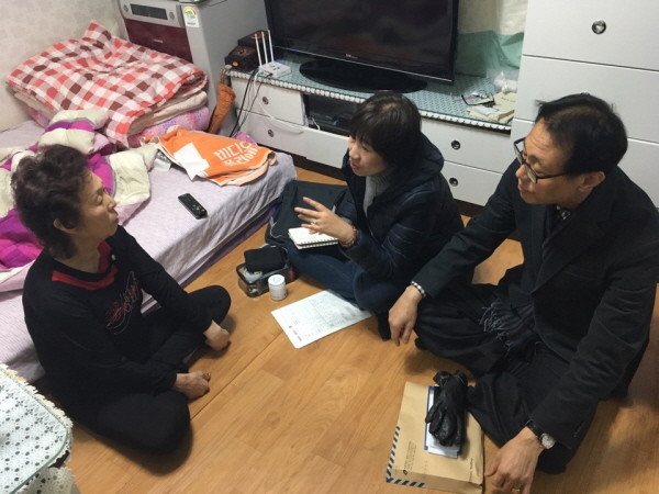 | ▲ 노인가정을 직접 방문해 우울증 검사 등 건강관리 상담서비스를 펼치는 군자동 주민센터 직원들.(사진제공=광진구청) | ||