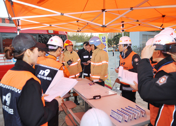 구로소방서는 지난 15일 고척도서관에서 화재발생을 가상한 긴급구조통제단 불시 가동훈련을 실시했다. 사진은 장현태 서장(가운데)이 소방공무원들에게 훈련 지시를 하는 모습.(사진제공=구로소방서)