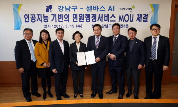 신연희 강남구청장(왼쪽에서 네번째)이 지난 15일 오전 강남구청에서 셀바스AI와 인공지능 기반 민원행정서비스 '강남봇' 운영 상호 MOU를 체결하고 김경남 셀바스AI 대표를 비롯한 관계자들과 함께 기념촬영하고 있다.(사진제공=강남구청)